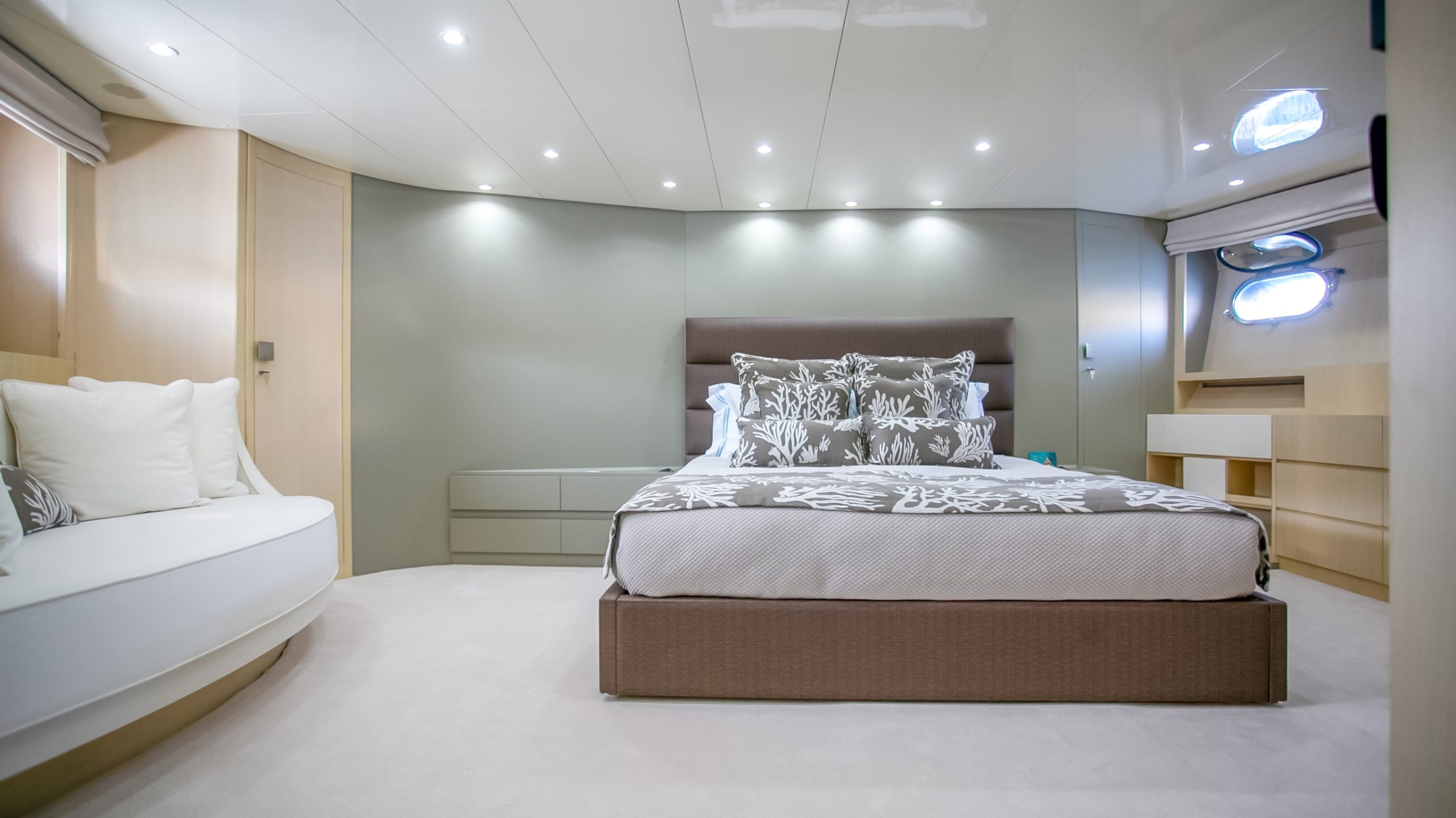 This yacht epitomizes elegance and style, boasting an exquisite neutral interior complemented by vibrant accents throughout.